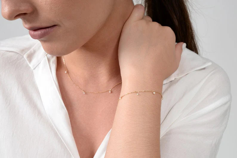 - Artisan Made ( Hand Made ) - Metals that can be used: Yellow Gold, Rose Gold or White Gold Freshwater Pearl 3.00mm each Number of pearls: 5 Chain: 40cm, 45cm or 50cm - Style: Dainty, Minimalist - If you are looking at customizing the piece to match your individuality, Contact us so we can keep you Inspired