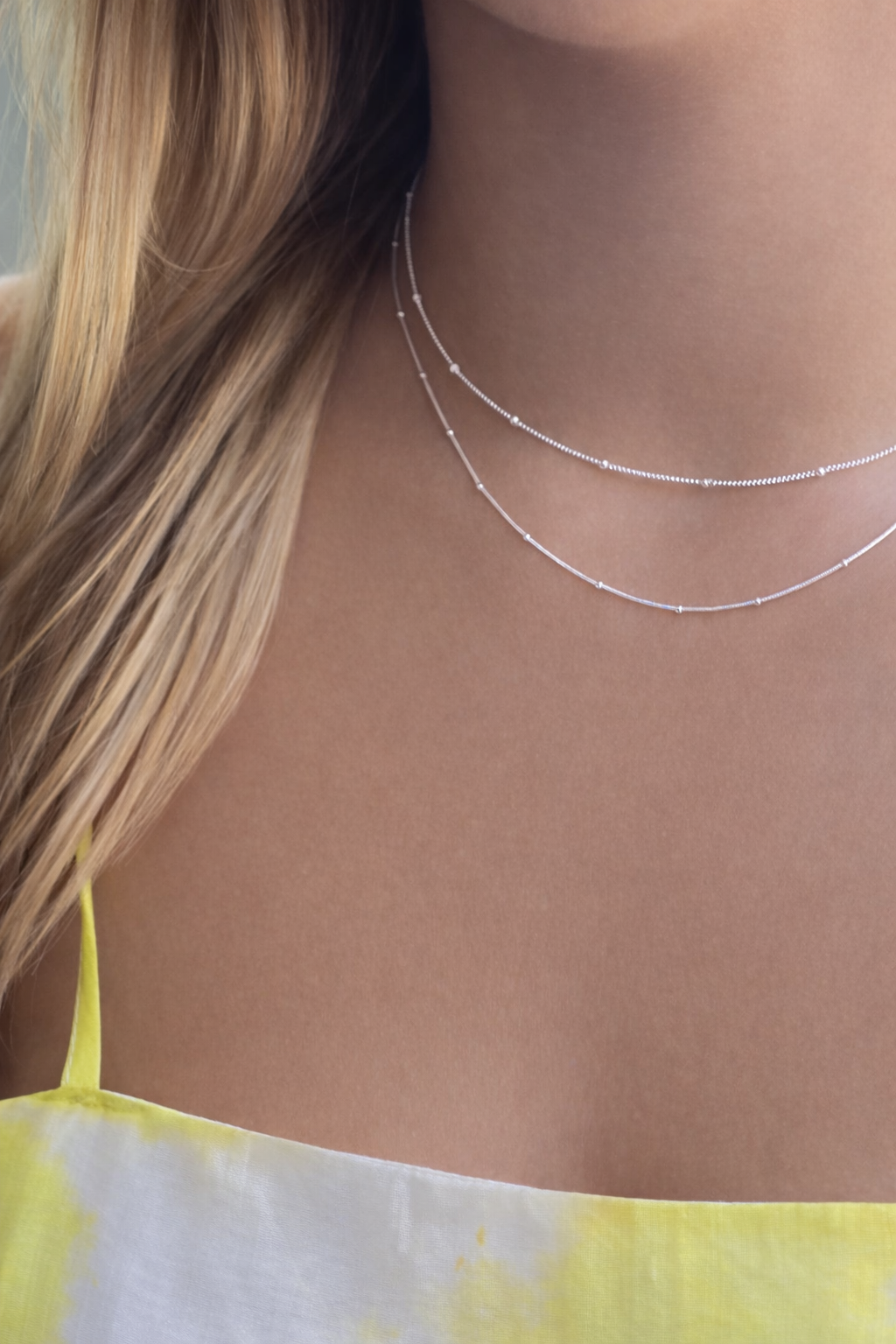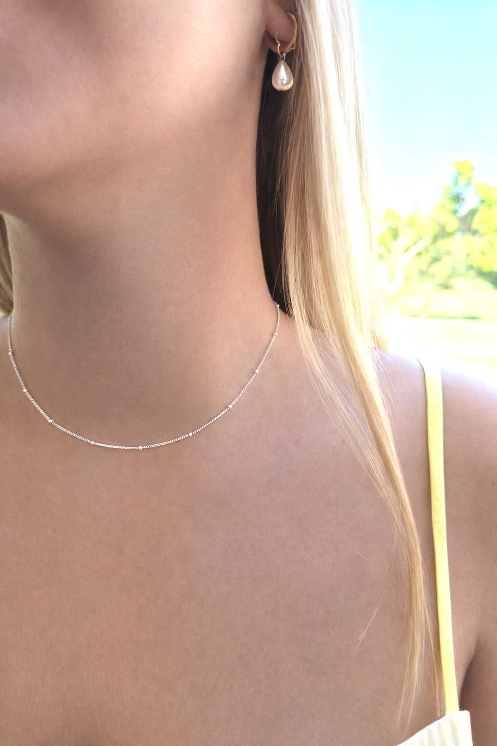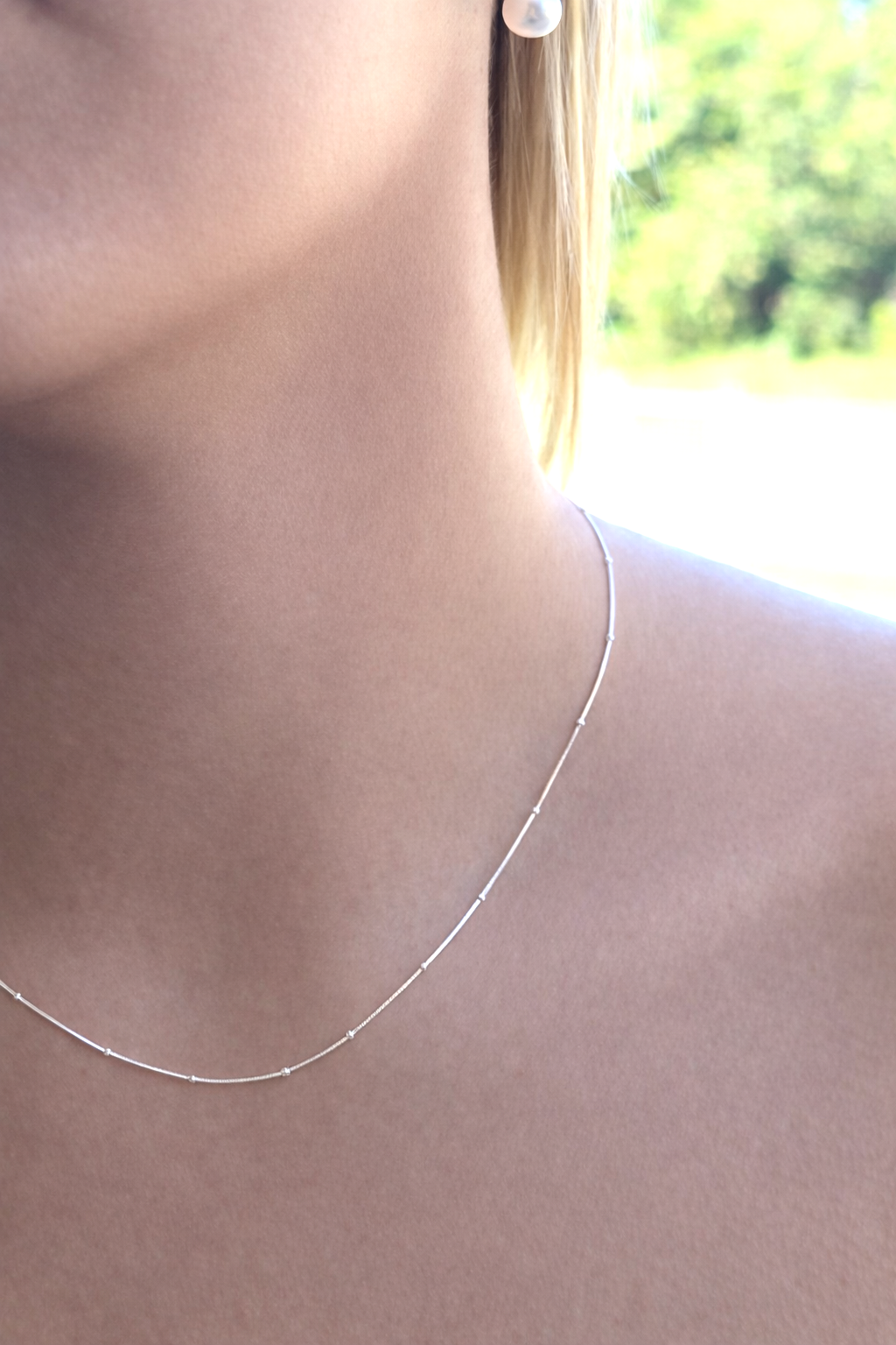 The Dot Sterling Silver Necklace is a delicate and elegant piece of jewellery that can effortlessly elevate any outfit. This necklace is made from high-quality sterling silver, which gives it a beautiful shine and long-lasting durability. The chain of the necklace is thin and lightweight, making it comfortable to wear all day long. It comes in three different lengths - 42cm, 45cm, and 50cm - so you can choose the one that suits your style and preference. One of the unique features of The Dot Sterling Silver is the small silver balls that are spaced every few centimetres along the chain. These balls add a subtle texture and visual interest to the necklace, without overpowering its simplicity and elegance. The dots catch the light beautifully, adding a touch of sparkle to the piece. The minimalist design of The Dot Sterling Silver Necklace makes it a versatile accessory that can be worn with a variety of outfits and styles. Whether you're dressing up for a special occasion or adding a touch of sophistication to your everyday look, this necklace will complete your outfit perfectly. In addition to being a stylish accessory, The Necklace also makes a thoughtful and meaningful gift for someone special. Whether you're celebrating a birthday, anniversary, or other special occasions, this necklace is a beautiful way to show your love and appreciation. Overall, The Dot Sterling Silver Necklace is a must-have accessory for anyone who appreciates understated elegance and timeless style. With its high-quality materials, unique design, and versatile appeal, this necklace is sure to become a cherished piece in your jewelry collection for years to come.