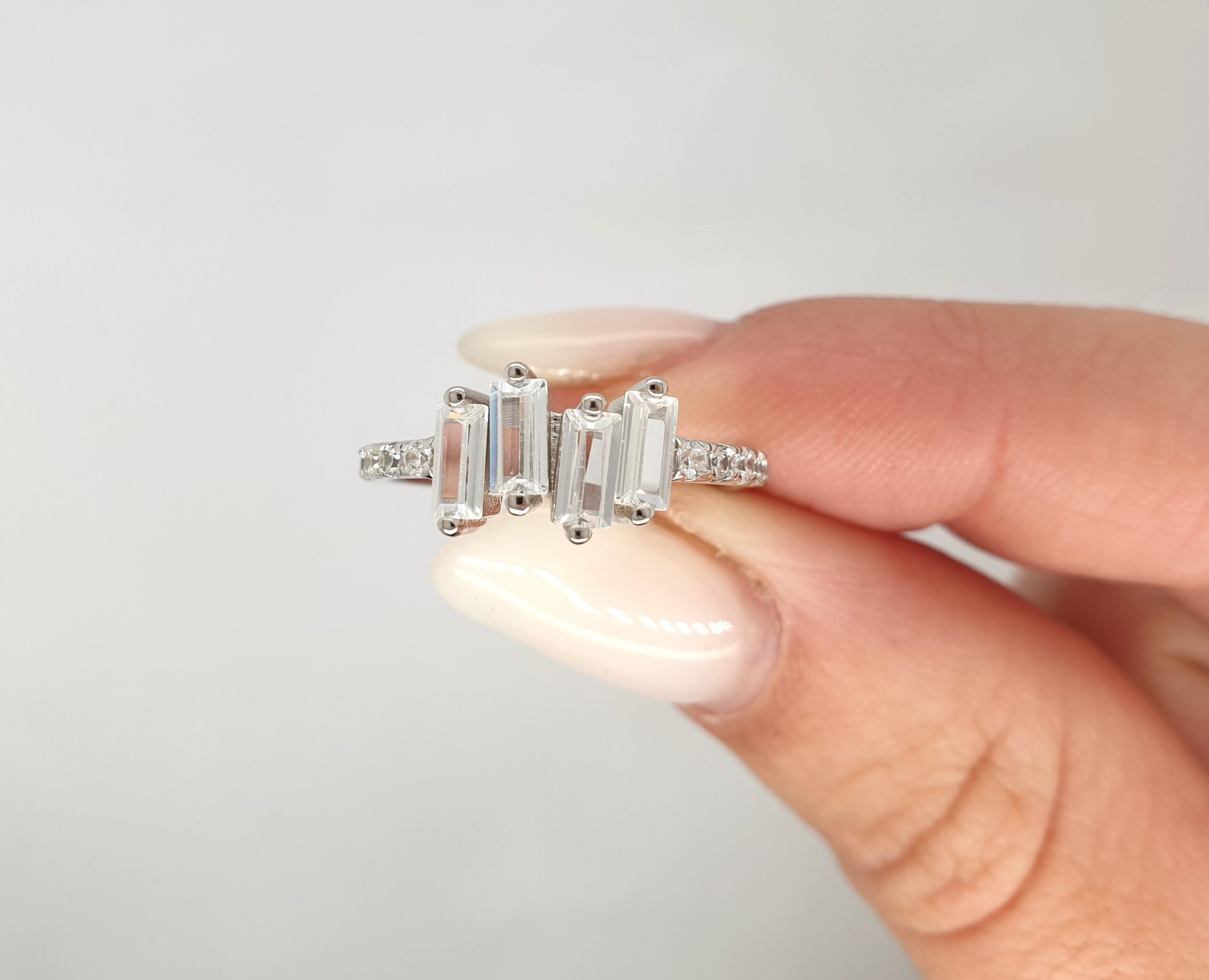 Introducing the Sloane Sterling Silver Ring, a remarkable blend of elegance and sophistication meticulously crafted from sterling silver and adorned with a stunning arrangement of cubic zirconia stones in square and baguette shapes. This ring epitomizes luxury with its exquisite design, offering a seamless fusion of classic charm and contemporary allure. Artisans intricately set each cubic zirconia stone within the framework of the ring, ensuring a flawless finish that captivates the eye. This meticulous craftsmanship creates a mesmerizing display of brilliance and shimmer, elevating the ring to a true statement piece. What sets the Sloane Sterling Silver Ring apart is its unique combination of square and baguette cubic zirconia stones. This innovative design adds a modern twist to its timeless appeal, effortlessly complementing any ensemble with grace and style. Transitioning seamlessly from day to night, the Sloane Sterling Silver Ring is a versatile accessory that effortlessly enhances any look. Whether worn alone for a subtle touch of glamour or paired with other jewelry for a more dramatic effect, it exudes elegance and refinement on any occasion. Moreover, the Sloane Sterling Silver Ring holds sentimental value as a symbol of timeless beauty and enduring love. The cubic zirconia stones, with their radiant sparkle, symbolize the eternal bond shared between loved ones, making this ring a cherished keepsake for years to come. In conclusion, the ring is more than just a piece of jewelry; it is a work of art that reflects sophistication and refinement. Crafted from sterling silver and adorned with exquisite cubic zirconia stones, it exudes luxury and elegance. Whether worn for special occasions or as an everyday accessory, this ring is sure to make a statement, adding a touch of glamour and style to any outfit.