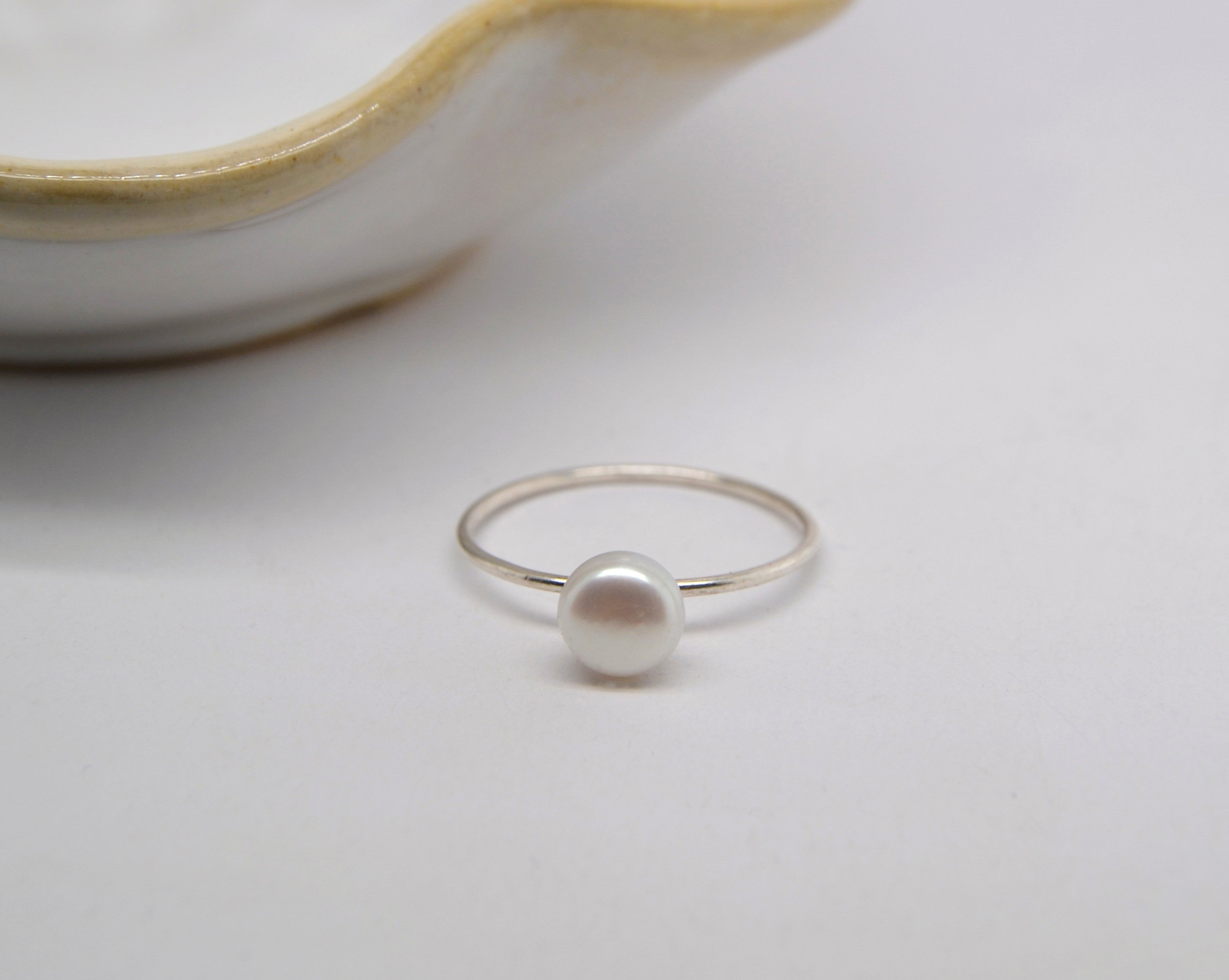 The Pearl Ring is an exquisite piece of jewelry that boasts a freshwater pearl delicately set on a thin sterling silver round band. The pearl is around 3-4mm in size, which makes it a perfect centerpiece for this timeless and elegant ring. Crafted with precision and care, the ring has a simple yet sophisticated design. The thin sterling silver round band adds a delicate touch, while the freshwater pearl adds a touch of class and sophistication. The ring's design is versatile and perfect for any occasion, whether you're going for a casual day out or a formal event. This classic piece of jewelry is made to last for a lifetime. Its quality craftsmanship and timeless design make it a perfect accessory for any outfit or style. The Pearl Ring is a must-have for anyone who appreciates fine jewelry. If you're looking for a special gift for someone you love, The Pearl Ring is an excellent choice. Its simplicity and elegance make it a perfect way to show your loved one how much they mean to you. It's a wonderful way to celebrate a special occasion or simply to let someone know that you're thinking of them. In conclusion, The Pearl Ring is a stunning piece of jewelry that showcases the beauty of freshwater pearls and the delicate elegance of sterling silver. Its timeless design, quality craftsmanship, and versatility make it a must-have for any jewelry collection. So, whether you're treating yourself or someone you love, don't wait any longer to get your hands on this exquisite piece of jewelry.