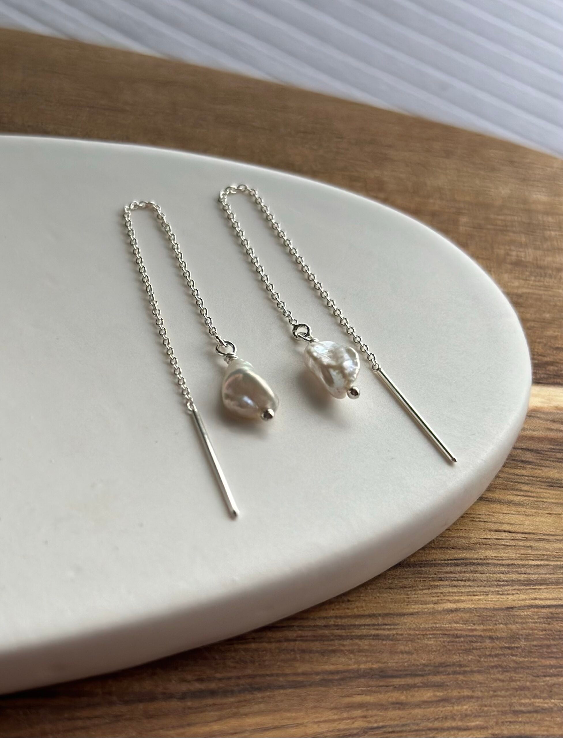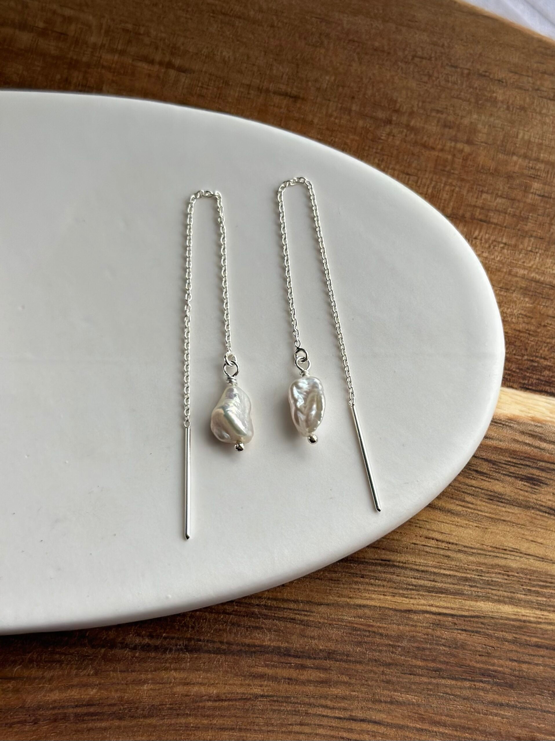 Introducing the Thread Through Pearl Earring, where modern design meets classic elegance. Crafted from premium sterling silver, this earring offers durability and a sleek, polished finish that enhances any outfit. The design features a slender silver chain that threads smoothly through your ear, creating a graceful line that highlights your natural beauty. At the end of this elegant chain, a lustrous freshwater pearl hangs delicately, adding a touch of sophistication and timeless appeal. The pearl’s natural iridescence contrasts beautifully with the cool silver, creating a harmonious balance that is both eye-catching and refined. Since freshwater pearls are known for their organic beauty and unique character, each earring has a slightly different look, making your piece truly one-of-a-kind. The Thread Through Pearl Earring isn’t just jewelry; it’s a statement of style. You can wear it alone for a subtle, elegant look, or pair it with other earrings for a more layered, fashion-forward appearance. The ease of threading the earring through your ear ensures a comfortable fit, while the secure design keeps it in place throughout the day. Sterling silver, known for its durability and resistance to tarnish, keeps your earring shining with minimal maintenance. The freshwater pearl adds a luxurious touch, making this earring perfect for both everyday wear and special occasions. Whether you’re adding to your personal collection or searching for the perfect gift, the Thread Pearl Earring is sure to impress. Its blend of modern design and classic elements makes it a versatile addition to any jewelry collection, embodying both elegance and contemporary style. This is the perfect gift.