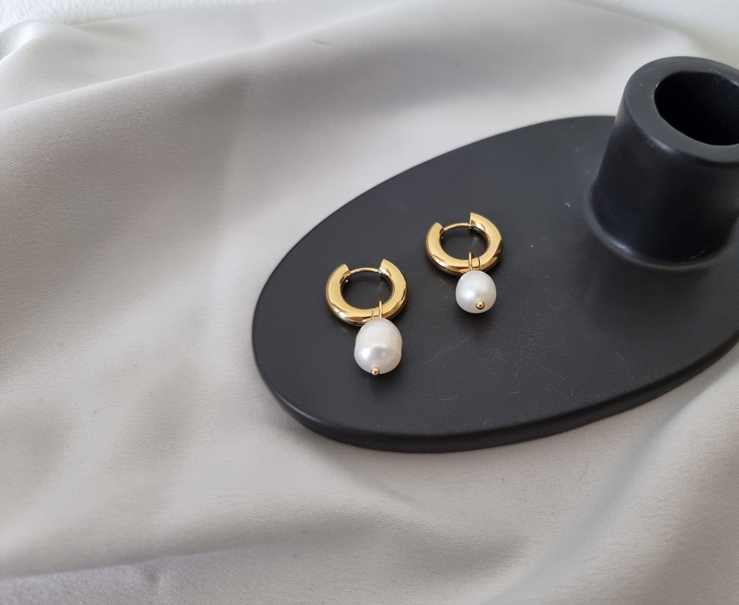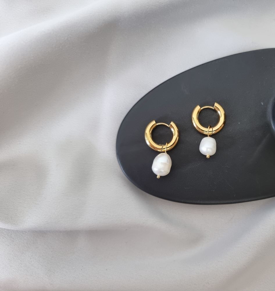 Introducing our Pearl Stainless Steel Huggies, where sophistication meets durability, promising to effortlessly elevate your style. Crafted from top-quality gold-plated stainless steel, these huggie earrings offer both luxurious aesthetics and long-lasting resilience. Featuring a charming freshwater pearl pendant, they add a touch of timeless elegance to any ensemble. The Pearl Stainless Steel Huggies boast a seamless design that delicately hugs your earlobes, providing a comfortable and secure fit throughout the day. The gold-plated stainless steel not only enhances the visual appeal of the earrings but also ensures they are waterproof, tarnish-proof, and hypoallergenic. This means you can wear them with confidence, knowing they will maintain their shine and beauty even when exposed to moisture. At the heart of each huggie earring hangs a lustrous freshwater pearl, adding a touch of natural beauty and sophistication to the design. Freshwater pearls are renowned for their iridescent luster and organic charm, making them a timeless addition to any jewelry collection. Whether you're dressing up for a special occasion or adding a hint of elegance to your everyday look, these earrings are sure to make a statement. Versatile and chic, our Pearl Stainless Steel Huggies effortlessly complement a variety of styles and outfits. Whether paired with a classic little black dress or worn with jeans and a t-shirt, they add a touch of refinement and polish to any ensemble. Their understated elegance makes them perfect for both formal events and casual outings, ensuring you always look your best no matter the occasion. In summary, our Pearl Stainless Steel Huggies are the epitome of sophistication and versatility. Crafted from gold-plated stainless steel and adorned with lustrous freshwater pearls, these earrings offer both style and durability. Elevate your look with these timeless accessories and let their natural beauty and charm shine through with every wear. Perfect.