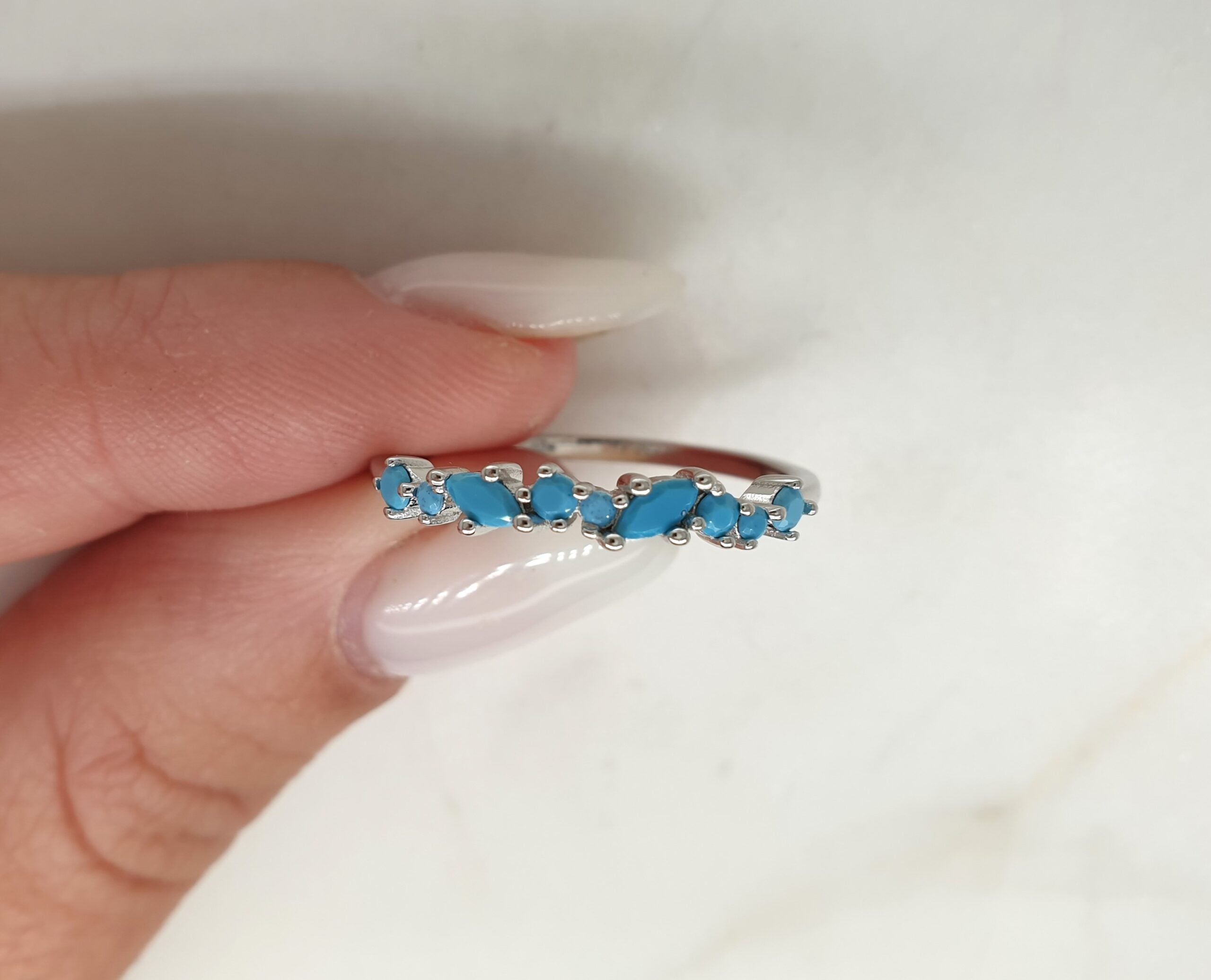 Introducing the Alyssa | Silver Ring, a captivating blend of modern design and timeless elegance. Meticulously crafted from sterling silver, this exquisite ring features a unique and eye-catching design that sets it apart from the rest. At its centerpiece lies a stunning array of blue-colored stones arranged in a broken pattern, adding a touch of sophistication and intrigue to the piece. The arrangement of blue-colored stones creates a striking contrast against the sterling silver band, drawing the eye and capturing attention with its bold and contemporary aesthetic. Each stone is carefully set, ensuring a secure fit and allowing them to sparkle and shimmer with every movement. Transitioning effortlessly from day to night, the Alyssa Silver Ring is a versatile accessory that complements any ensemble with its understated elegance. Whether worn as a standalone statement piece or paired with other jewelry for a more layered look, its unique design adds a touch of personality and flair to any outfit. Perfect for those who seek to make a statement with their accessories, the Alyssa Ring is a symbol of individuality and style. Its sterling silver construction ensures durability and longevity, allowing you to cherish this exquisite piece for years to come. Additionally, the blue-colored stones add a pop of color and vibrancy, making it a standout addition to your jewelry collection. In conclusion, the Alyssa | Silver Ring is a true masterpiece of craftsmanship and design. With its captivating broken pattern of blue-colored stones and sterling silver band, it exudes sophistication and elegance in every detail. Whether worn for everyday elegance or special occasions, the Alyssa Ring is sure to become a cherished favorite, reflecting your unique sense of style and personality.